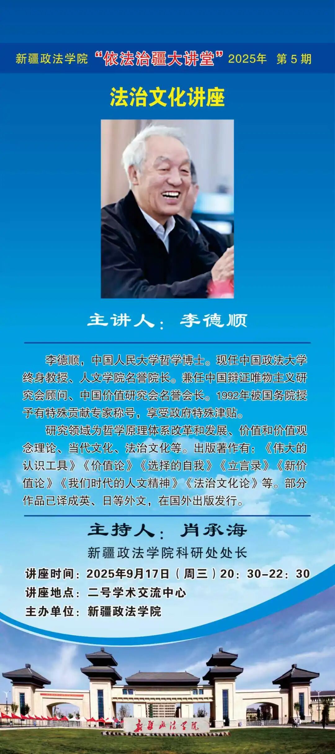 9月17日,我校特邀中国政法大学终身教授、人文学院名誉院长李德顺,作题为《法治文化》的专题讲座。本次依法治疆大讲堂由新疆政法学院科研处处长肖承海主持。校党委常委、副校长马召伟、万朝林、祁欢,全校教师代表与学生代表参加。